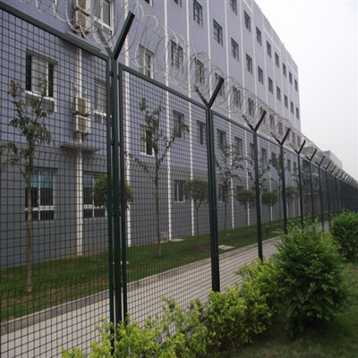 看守所護欄網又稱作"Y型安全防御護網”,是由V型支 架立柱,加強型焊接片網,安全防盜連接件和熱鍍鋅刀片剌籠組成強度和安全防御性級別很高?,F被廣泛應用在監獄,軍事基地等高安全場所。