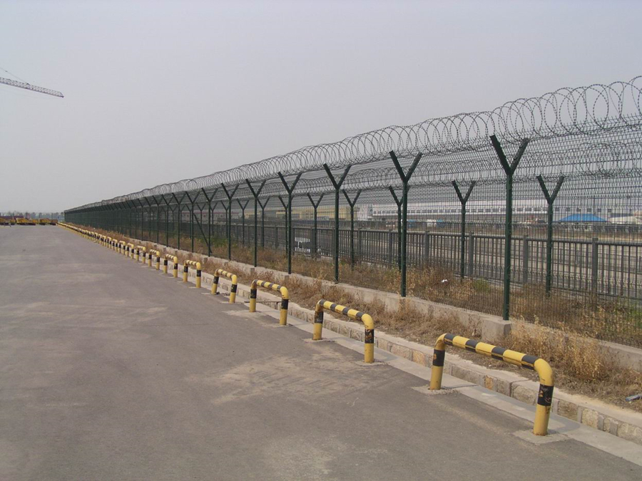 機場圍界是機場的重要安全防護網,我廠生產的護欄網超過國家標準可以使用15年以上現在機場鋼筋網圍界又稱作”機場防護欄”、"Y型安 全防御護網”,它是由V型支架立柱加強型焊接片網,安全防盜連接件和熱鍍鋅刀片刺籠組成是強度和安全防御性級別很高的隔離柵產品。近年來被廣泛應用在機場,軍事基地等高安全場所。 注如果在機場護欄網頂部加裝刀片剌絲、刀片剌繩后又很好的增強了安全防護性能。機場圍界網可以采用電鍍、熱鍍、噴塑、浸塑等防腐形式,具有很好的抗老化、抗曬、耐候等特點。其產品造型美觀、花色多樣,既起到圍欄作用,又起到美化作用。我廠可以根據用戶需要定作各種規格尺寸的機場護欄機場防護設施。