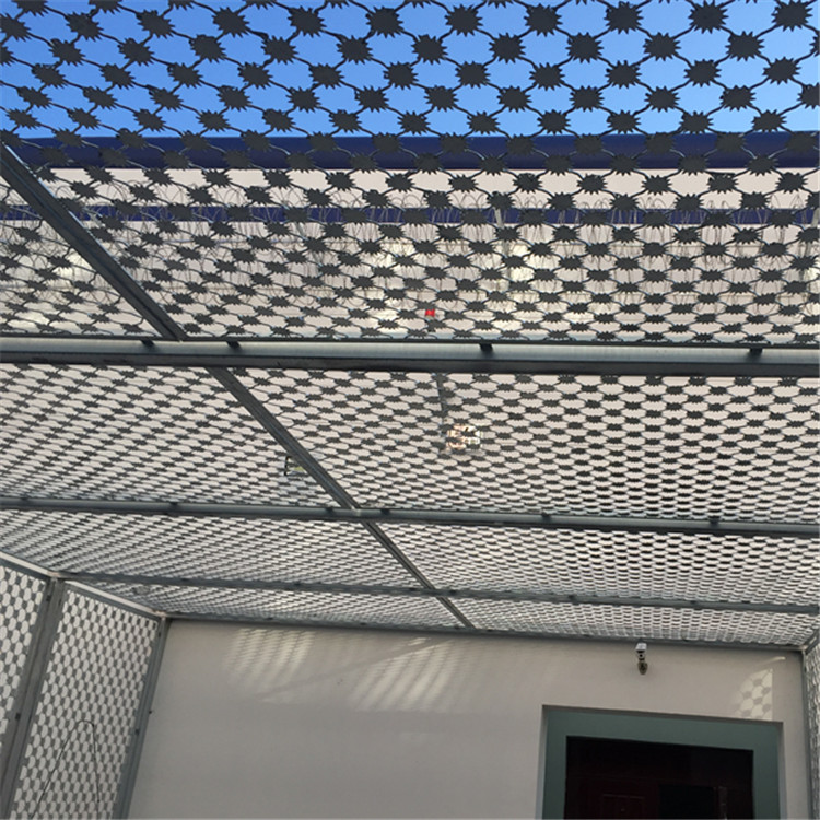 5、刀片滾網、拉絲、卡扣,均采用不銹鋼材質。刀刺網安裝固定卡扣整體調正,使刀刺網不出現擰轉情況,刀刺刺圈分布均勻,每隔30-40cm與拉絲固定;分段連接處需將兩端刀刺網做連接固定,刀刺網固定點需緊鎖不得出現松動、脫落現象;刀刺網安裝與隔離網平行,上下左右均成直線延伸,轉角處需做加密加固處理。