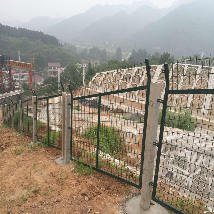 5、防腐處理:金屬網(wǎng)片及柵欄門的網(wǎng)片成形后應(yīng)整體鍍鋅并進行熱浸塑(或噴塑)處理,鍍鋅量270g/m2,浸塑厚度0.8mm~ 1.2mm,顏色選用墨綠色。涂層應(yīng)均勻,顏色-致,表面光滑,無流柱,滴瘤、粉泡、漏鐵等缺陷。網(wǎng)片制造精度要求:長度誤差≤2.5mm,高度誤≤3.0mm。網(wǎng)片平整度要求:凸起或凹進值≤5.0mm.冷拔鋼絲鍍鋅前直徑誤差≤0.06mm。焊接網(wǎng)孔誤差≤3.0mm.焊接網(wǎng)片連接板時,連接板焊接位置應(yīng)嚴格控制在設(shè)計位置,其位置誤差≤1.5mm。矩管邊框與連接板、網(wǎng)片鋼絲與鋼板、網(wǎng)片鋼絲與矩管邊框的焊接宜采用電阻焊、如用釬焊,應(yīng)選用合適的焊條,使其變形。焊接后應(yīng)清理焊渣。對焊接產(chǎn)生的變形,應(yīng)進行平整處理。為保證網(wǎng)片自身有足夠的強度,網(wǎng)片焊接點的強度應(yīng)大于1KN,焊接點脫落數(shù)小于4%。
