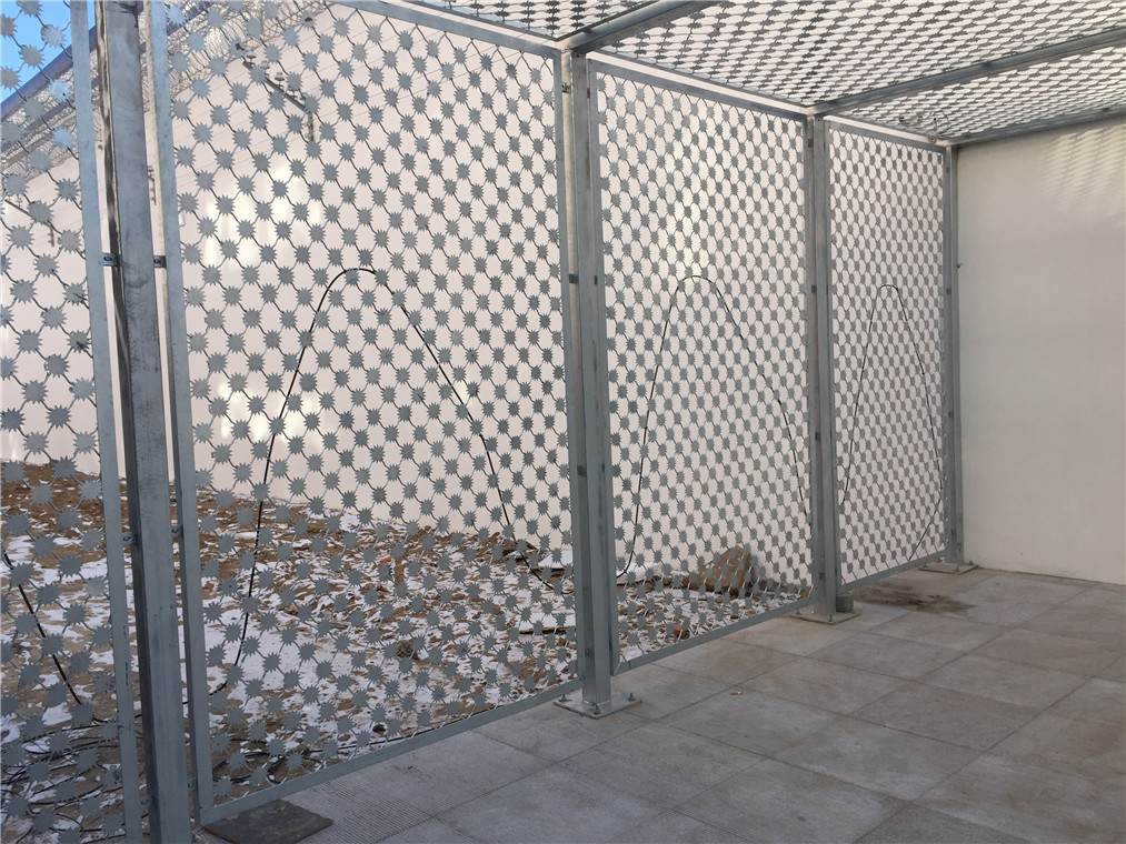 像梅花刺片的隔離網大家應該都不陌生,經常在監獄里應用,南方很多監獄內墻都是用的這種。我們北方很多是AB大門的通道使用這種梅花刺片隔離網。防攀爬防爆效果非常好,適合在這些特殊場合使用。