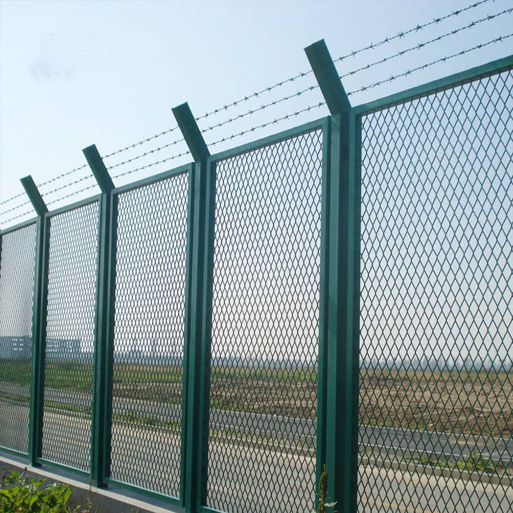 邊框與立柱和底部基臺之間的距離一般為50mm,立柱一般采用 DN65焊管高度不低于2.6米(含300mm彎頭),直徑不小于70mm (塑前厚度),壁厚3.5mm。邊框一般采用DN32焊管,邊框高2.2米,寬1.5米,邊框直徑不小于40mm (塑前厚度) ,壁厚2.5mm。金屬網采用鋼板網直徑不小于5mm (塑前厚度),網眼見方大小為50*50mm ,不大于0.0025 平米,上部帶刺鐵絲網型號為 12*14 ,立柱頂端30公分彎頭拉設三道鐵絲網,每根間距0.1米,立柱、邊框、金屬網與刺鐵絲網外部處理為除銹,熱鍍鋅( 鍍鋅量不低于220g/m2 ),外部浸塑(草綠色),立柱底部為法蘭盤,與底部基礎之間用不銹鋼脹管螺栓固定。