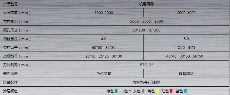 特點:如果在機場護欄網頂部加裝刀片刺絲、刀片刺繩后又很好的增強了安全防護性能。采用電鍍、熱鍍、噴塑、浸塑等防腐形式,具有很好的抗老化、抗曬、耐候等特點。其產品造型美觀、花色多樣,既起到圍欄作用,又起到美化作用。由于具有安全性高、防攀爬能力好,網片連接方式采用特制SBS緊扣件,有效防止人為的破壞性拆卸,橫向四道折彎加強筋,使網面強度顯著增加。