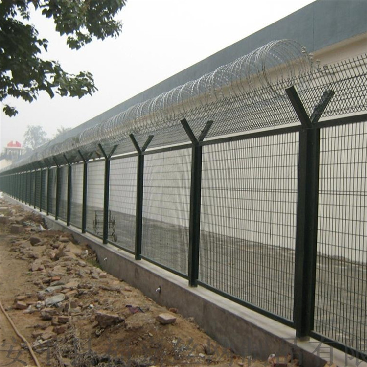 監獄鋼網墻又稱作“Y型安全防御護網”,是由V型支架立柱,加強型焊接片網,安全防盜連接件和熱鍍鋅刀片刺籠組成強度和安全防御性級別很高。近年來,被廣泛應用在監獄,軍事基地等高安全場所。在監獄鋼網墻頂部加裝刀片剌絲、刀片剌繩后又很好的增強了安全防護性能。采用電鍍、熱鍍、噴塑、浸塑等防腐形式,具有很好的抗老化抗曬、耐候等特點。產品造型美觀、花色多樣,既起到圍欄作用,又起到美化作用。由于具有安全性高、防攀爬能力好網片連接方式采用特制sbs緊扣件,有效防止人為的破壞性拆卸橫向四道折彎加強筋,使網面強度顯著增加。