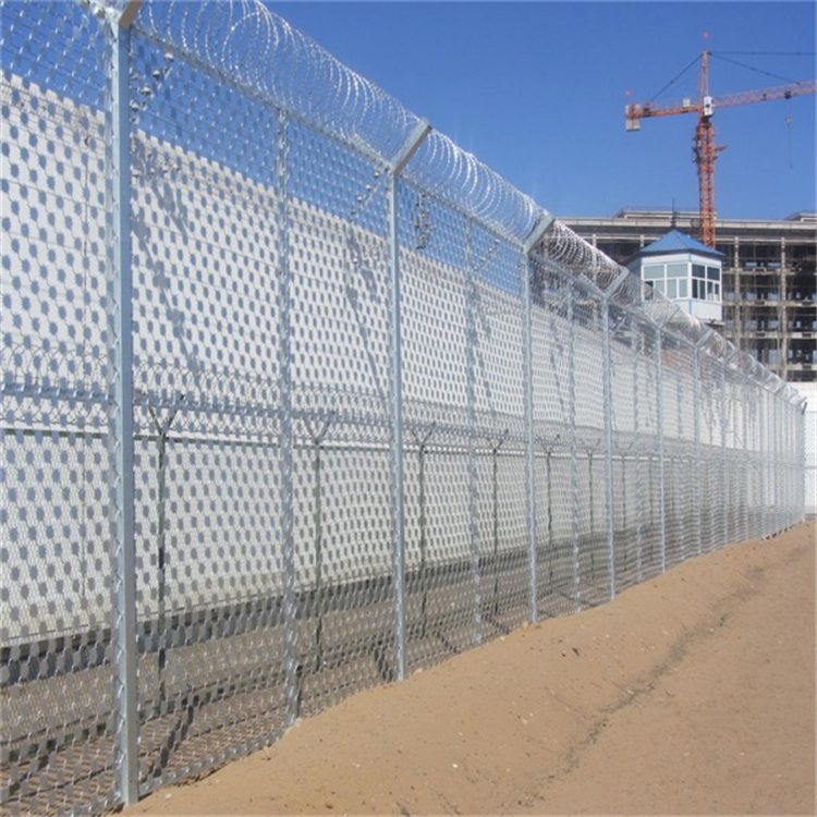 監獄防攀爬護欄網是菱形的網格,太陽花刺片由Q235低碳鋼板沖壓而成,其直徑大于7.5cm,刺片厚度為1.3mm。網格尺度為85*85mm , 100*100mm也可定制.監獄防攀爬護欄網的結構和柱子選用邊耳銜接方式固定,邊耳選用扁鐵加工,規格為50*50*5mm.側耳的螺絲孔可根據裝置要求進行調理,調理距離不小于。側耳的固定螺栓是直徑14mm * 50mm的熱浸鍍鋅螺栓。立柱由Y形鍍鋅鋼管制成,鋼管150*150*8mm網架的尺度為60*60*2.5m.監獄防攀爬護欄網的尺度為2500 * 3000mm,4000*3000mm此外,監獄防攀爬護.