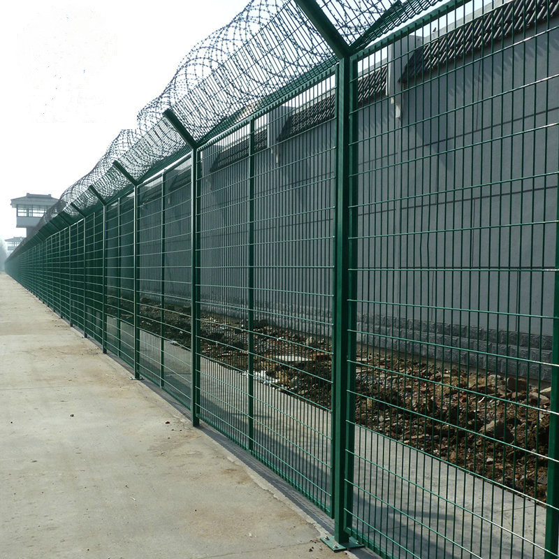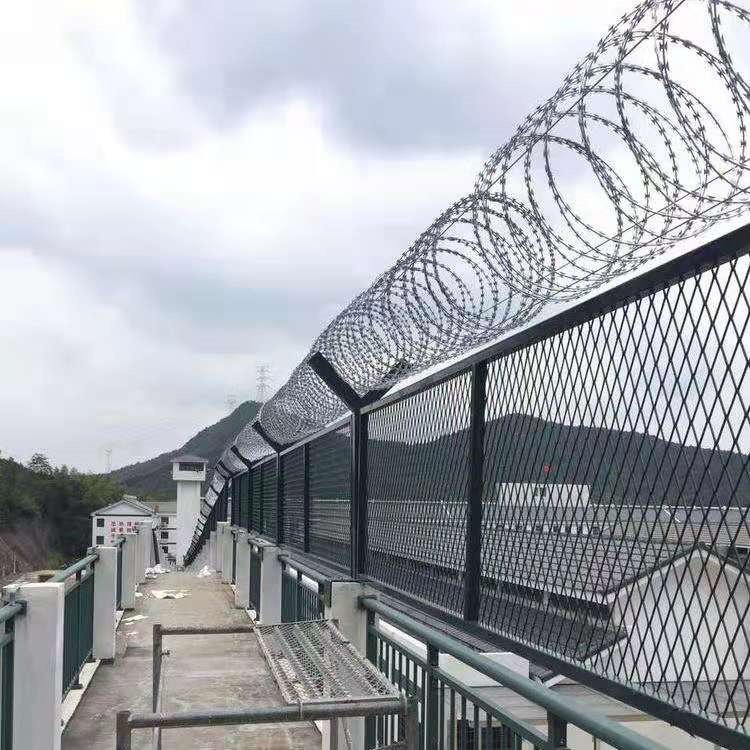 形、長方形,也可以焊接成菱形,也可以直接采用刀片刺繩焊接網或鋼板網材料的網片,還有造價較高的梅花刺片和358密紋網,然后在網片的基礎上四周焊接邊框,防腐進行pvc浸塑或噴塑處理。頂端安裝刀片刺繩,刀片剌繩擁有鋒利的刀片,手不能握,可以阻止非法分子的攀爬,從而使鋼網墻從外形上邊可以起到震撼的作用。
